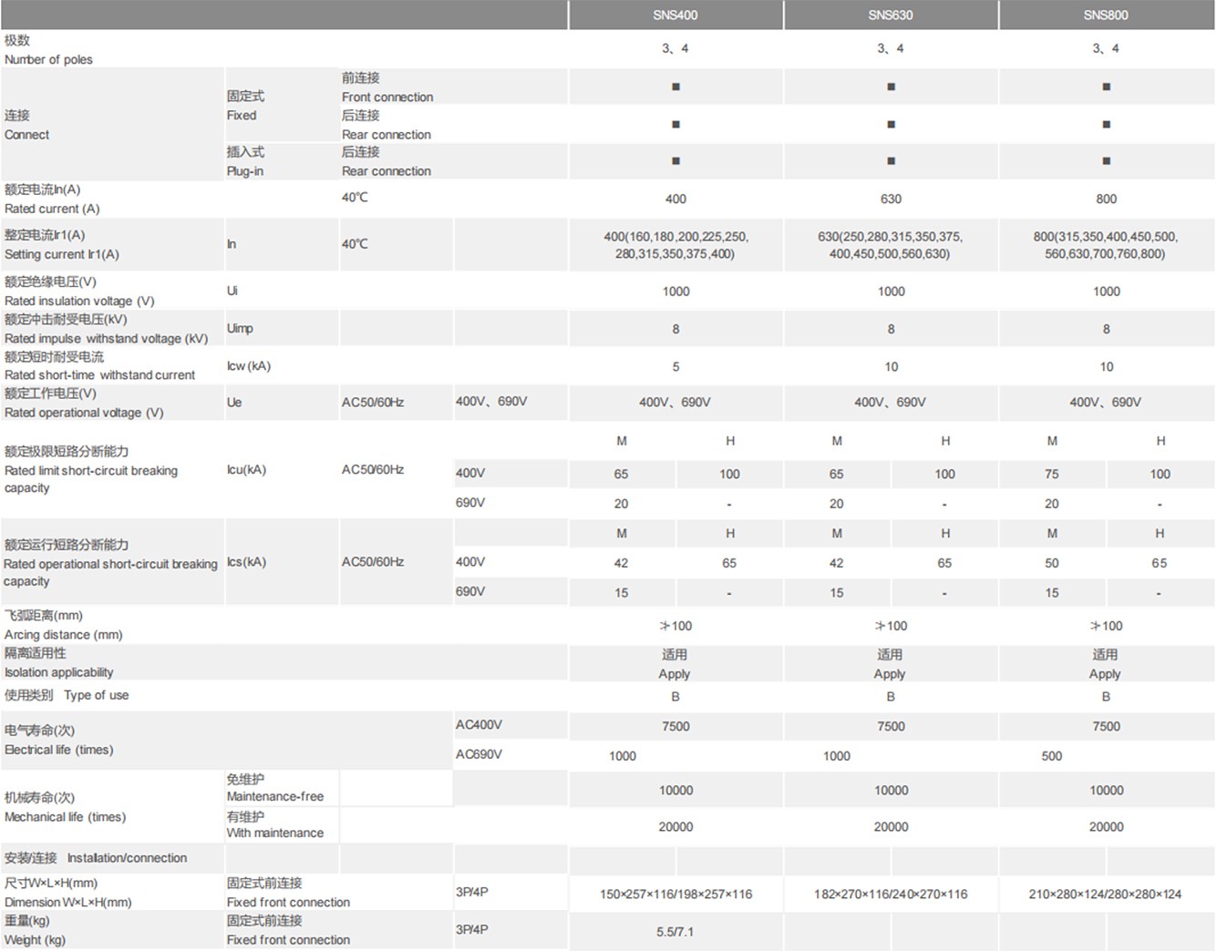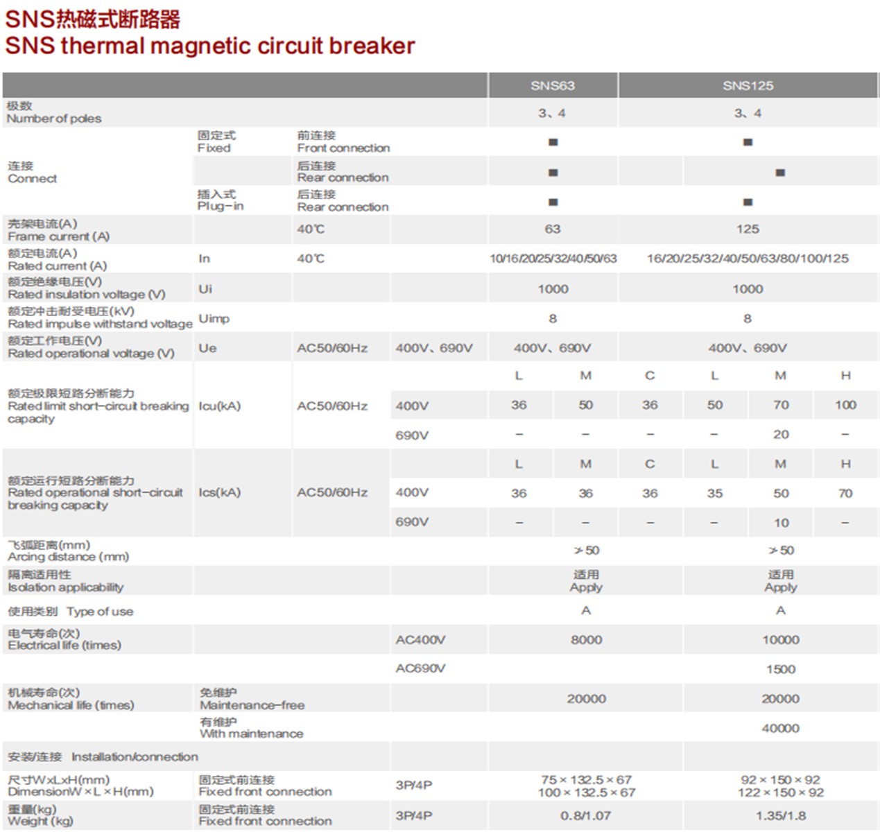 SNS thermal magnetic circuit breaker with overload, short circuit and undervoltage protection function, can protect the line and power equipment from damage. There are 63 type, 125 type, 250 type, 400 type, 630 type, 800 type six shell frame, current from 16A to 800A.
