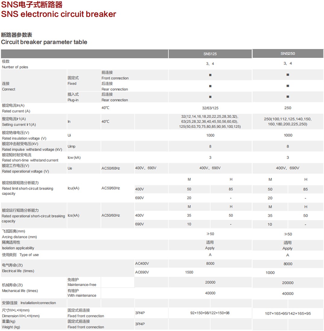 SNS electronic circuit breaker has overload long delay inverse time, short circuit short delay inverse time, short circuit short delay fixed time, short circuit instantaneous, undervoltage protection and phase protection function (optional). Among them, the controller with communication interface can be "four remote", to achieve parameter modification, fault reading to meet the requirements of the control center and automation system. There are 125M/H type, 250M/H type, 400M/H type, 630M/H type, 800M/H type five shell frame, current from 12A to 800A.