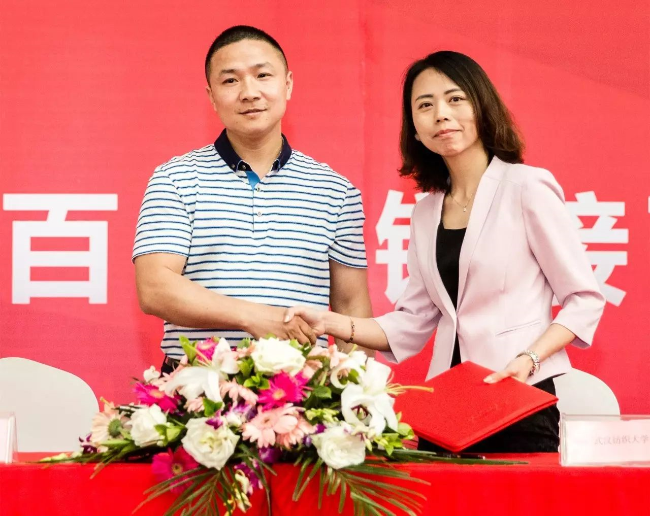 武汉纺织大学校企合作促进会签约仪式,右一为武汉纺织大学机械工程与自动化学院党委副书记卫东妹,左一为AC米兰中文官网智慧城市建设有限公司总经理韩文