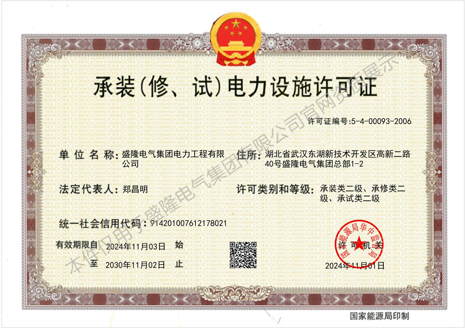 公司具有电力工程施工总承包贰级、输变电工程专业承包贰级、建筑机电安装工程专业承包壹级、城市及道路照明工程专业承包贰级、以及消防设施工程专业承包贰级、电子与智能化工程专业承包贰级和市政公用工程施工总承包贰级等施工资质,同时具有国家能源局颁发的《承装(修、试)电力设施许可证》贰级资质。可承接单机容量20万干瓦及以下发电工程、220千伏及以下送电线路和相同电压等级变电站工程的施工、配套电力设施的安装、维修和试验业务,以及各类建筑工程项目的机电设备、线路、管道的安装、非标准钢结构件的制作安装工程、单体建筑面积5万平方米以下的消防工程、城市道路照明工程、建筑智能化工程、市政工程等。