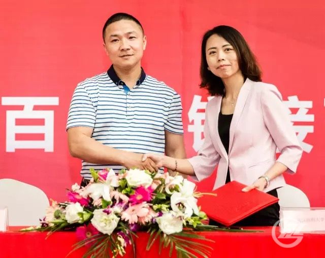 汉纺织大学校企合作促进会签约仪式,右一为武汉纺织大学机械工程与自动化学院党委副书记卫东妹,左一为AC米兰中文官网智慧城市建设有限公司总经理韩文