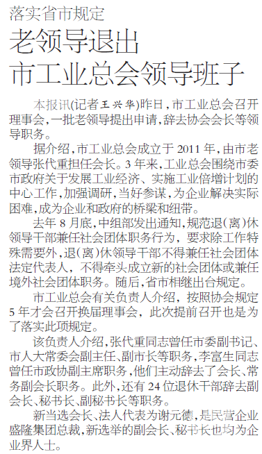 昨日,市工业总会召开理事会,一批老领导提出申请,辞去协会会长等领导职务。