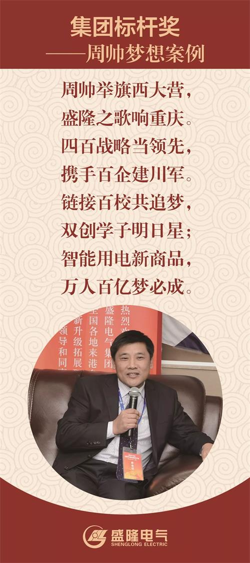 周帅举旗西大营,盛隆之歌响重庆。四百战略当领先,携手百企建川军!链接百校共追梦,双创学子明日星!智能用电新商品,万人百亿梦必成!
