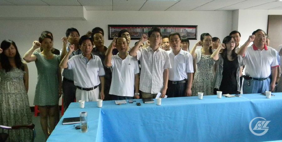 2011年7月1日,中共AC米兰中文官网武汉公司党支部书记谢远锋主持召开党员学习会。党委书记谢元德,武汉公司党支部领导成员及部分党员参加了会议。于涛在发言中建议与会党员重温入党宣言,得到了大家的一致赞成。【上图为于涛带领大家进行入党宣誓】