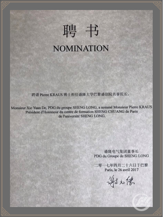 盛隆大学最新动态2017年4月26日,AC米兰中文官网巴黎盛创院成立。董事长签发聘书:聘请皮埃尔·克劳斯(Pierre KRAUS)博士担任盛隆大学巴黎盛创院名誉院长,聘请张颖女士担任盛隆大学巴黎盛创院院长。聘书皮埃尔·克劳斯皮埃尔·克劳斯1962年毕业于著名的法国高等电力学院并获得工程师文凭。继而在法国原子能委员会开...2017-04-30 -