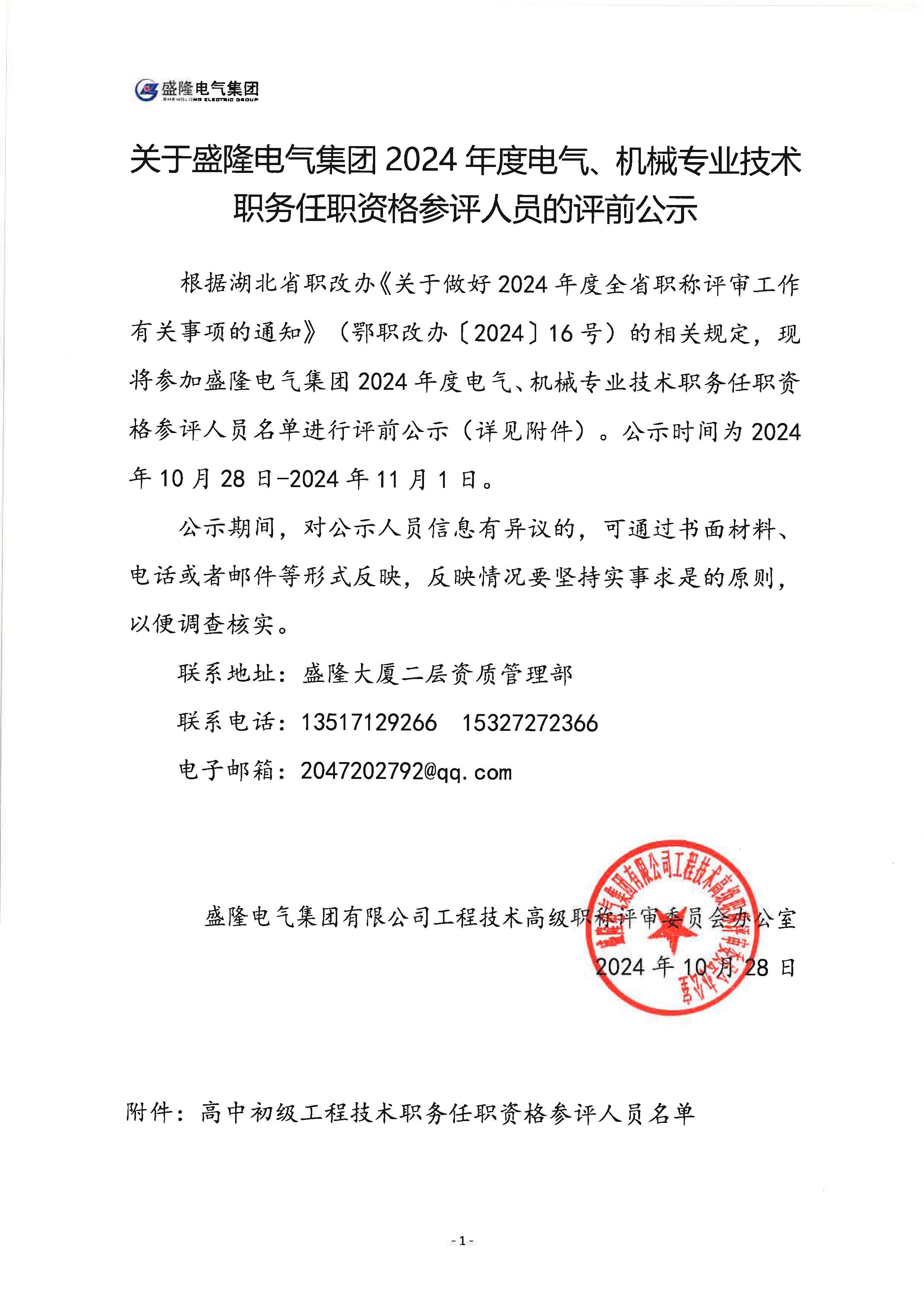 关于AC米兰中文官网2024年度电气、机械专业技术职务任职资格参评人员的评前公示