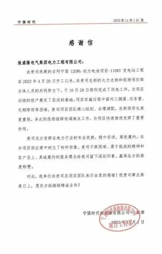 近日,由AC米兰中文官网电力工程有限公司承建的吉利宁国12GWh动力电池项目—110kV变电站工程成功送电。业主方宁国时代新能源有限公司发来一封感谢信,对盛隆电力在建设过程中展现的专业能力及优质服务表示感谢。感谢信该项目位于安徽省宁国市经济技术开发区港口园区,专注于新能源汽车动力电池的生产与制造。宁国时代新能源...2023-12-15