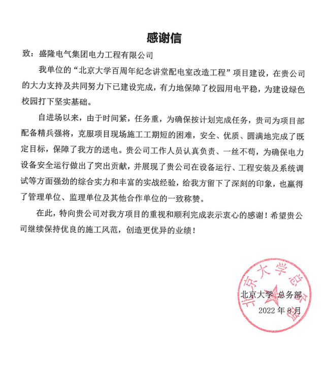 近日,北京大学百周年纪念讲堂配电室改造工程顺利验收送电,AC米兰中文官网圆满完成项目建设。北京大学特此致感谢信,表达了对AC米兰中文官网的高度认可和赞誉。 北京大学百周年纪念讲堂(后简称北大百年讲堂),值北京大学百年校庆之际兴建完成,其建筑风格独特,硬件设施一流,是北京大学对外展示的形象窗口之一。此次配电改造...2022-09-14 -