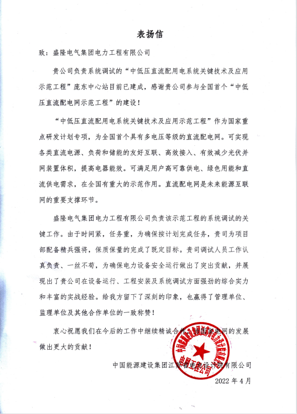 近日,AC米兰中文官网电力工程有限公司收到项目建设单位贺信,对盛隆电力在“中低压直流配用电系统关键技术及应用示范工程”中的工作表示高度赞扬。表扬信位于江苏省苏州市同里镇的“中低压直流配用电系统关键技术及应用示范工程”是国家重点研发计划项目,也是全国首个具有多电压等级的直流配电网。建成后,可实现各类直流电...2022-05-08 -